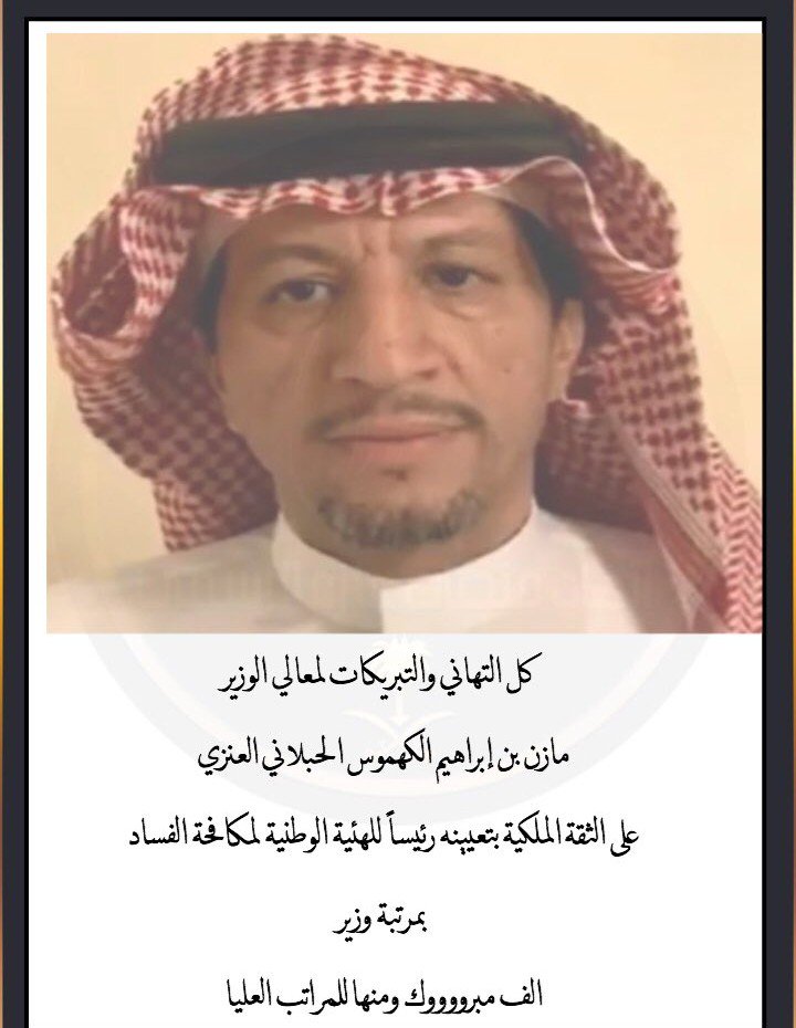 Sulaiman Eid Al Enezi Pa Twitter تــــهنئـه الف مبروك لابن العم الاستاذ مازن بن إبراهيم الكهموس العنزي تعينه رئيسا علي مرتبه وزير للهيئه الوطنيه لمكافحة الفساد الله يعينه علي حمل الأمـــــانة